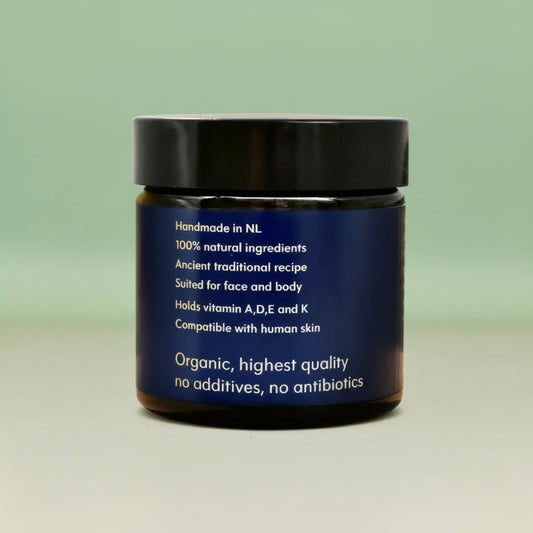 Het is bewezen dat dierlijke vetten het beste zijn voor het voeden en verzorgen van de huid. Ze werken in perfecte harmonie samen met de huidcellen om ze gezond, soepel en sterk te houden. Elk van onze producten is met de hand vervaardigd, gevuld, en gelabeld. Wij willen graag precies weten wat er in elke pot gaat, waar elk ingrediënt vandaan komt en gegarandeerd zijn dat dit altijd van de beste kwaliteit en hoogste graad is.